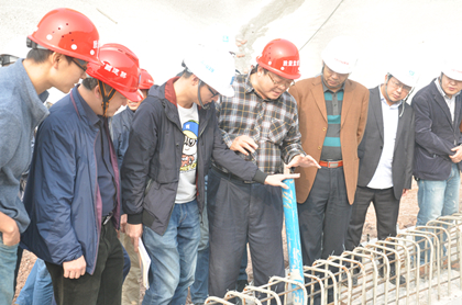 验收小组在十二标项目总工胡达亨、技术质量部经理杨海龙陪同下赴青岗坪站进行现场验收。小组成员对现场材料质量、设备以及安全进行提问,技术质量部经理杨海龙一一做出解答。随后,验收小组对青岗坪站现场钢筋绑扎、桩基测距、复孔侧位等工作进行了详细检查,并予以肯定。
