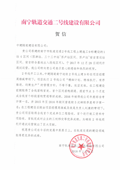 1月3日,中建隧道南宁地铁2号线土建9标项目收到南宁市轨道交通2号线建设有限公司贺信,南宁市轨道交通2号线建设有限公司在信中对中建隧道在南宁地铁2号线建设过程汇总做出的突出贡献表示感谢。