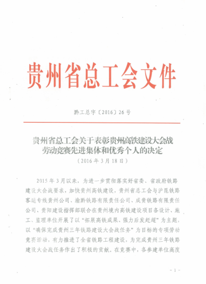 贵州省工人先锋号  贵州省五四红旗团支部  获奖文件 五月的渝黔骄阳似火,五月的渝黔花开如海。 在这个火红的五月里,五月四号这个特殊的日子,在渝黔人心中注定不平凡。 五一前夕,在贵州省总工会组织表彰的贵州高铁建设大会战劳动竞赛活动中,隧道公司渝黔铁路项目获得贵州省工人先锋号荣誉称号,项目经理杜永强获得贵州省五一劳动奖章嘉奖。 5月4日,在共青团遵义市委五四表彰大会上,受团省委委托表彰2015年优秀个人及先进团组织。隧道公司渝黔铁路项目团总支获评2015年贵州省五四红旗团支部荣誉称号。 劳动最光荣,青春最美丽。在五一国际劳动节和五四青年节来临之际,贵州省工人先锋号、贵州省五一劳动奖章、贵州省五四红旗团支部3项大奖花落渝黔,唱响渝黔。渝黔好故事,五局好声音,中国建筑的企业美誉再次传唱红色遵义。 渝黔铁路项目能够接连获得地方政府各类奖项,这与他们积极与地方政府开展联创共建活动密不可分。在项目党组织的带领下,围绕“党建带团建,群团促生产”积极开展创先争优工作。自2013年进场以来,项目获评各类奖项42项,其中国家级荣誉1项,省部级奖项6个,地市级奖项35个。(文/隧道公司渝黔铁路项目:文笑一)