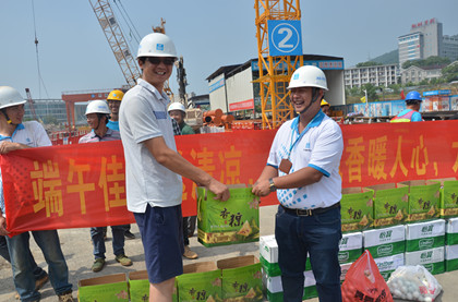 溁湾镇站地铁建设者端午节合影  周阳为土石方队伍送粽子 如火如荼五月艳阳天,又是一年粽子飘香时。 隧道公司长沙地铁4号线项目正进入主体施工大干快上施工阶段,现场施工员及劳务工人们传统佳节不休假,为地铁建设坚守岗位。项目执行经理周阳带领项目班子成员为溁湾镇站的主体结构、钢支撑、土石方等劳务单位送去了端午佳节的关心和施工安全的嘱咐。一箱箱清凉的矿泉水、一个个浓香四溢的粽子、一个个清洁秀美的咸鸭蛋以及防暑降温物资让坚守一线而辛勤付出、甘于奉献的地铁建设者们倍受鼓舞。 周阳指出:溁湾镇站全体参建人员正全面攻坚,希望各劳务队伍与项目部加强沟通、敏捷施工,通力协作为项目突破节点,实现8·30节点目标实现优质高效履约共同努力奋斗。(隧道公司长沙地铁4号线项目:谭梓妮)