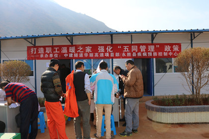3月20日,中建隧道华丽高速项目部联合永胜县疾病预防控制中心,为隧道进出口工区的劳务人员开展了一次大规模的体检活动。