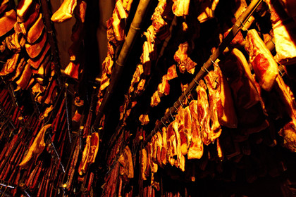 每到年关,在白雾茫茫的清晨,伴随着一阵阵狗吠声,村里的男女老少都忙活起来了,把家里养得白白胖胖的大猪处理好,作为美味佳肴的原始食材。猪肉按照纹理被打理成一条条,撒上白盐,便开始为猪肉条做“按摩”,保证肉块被腌制到位。腌制好肉后就需要将它挂起了晾一晾,任风与阳光尽情地亲吻它,带走它的血水。之后就到了最重要的步骤:烟熏。木头灰是烟熏它的主材料,加入不要的橘子皮可增加腊肉的香味,为了保证肉被烟熏到位,密闭的空间和合适的火候是必不可少的。村里人找来密闭性好的大铁桶,将肉块一块块地挂在里面,让其得到充分的熏陶,从红白相间到乌黑亮澄,一块块烟熏腊肉就新鲜出炉啦!